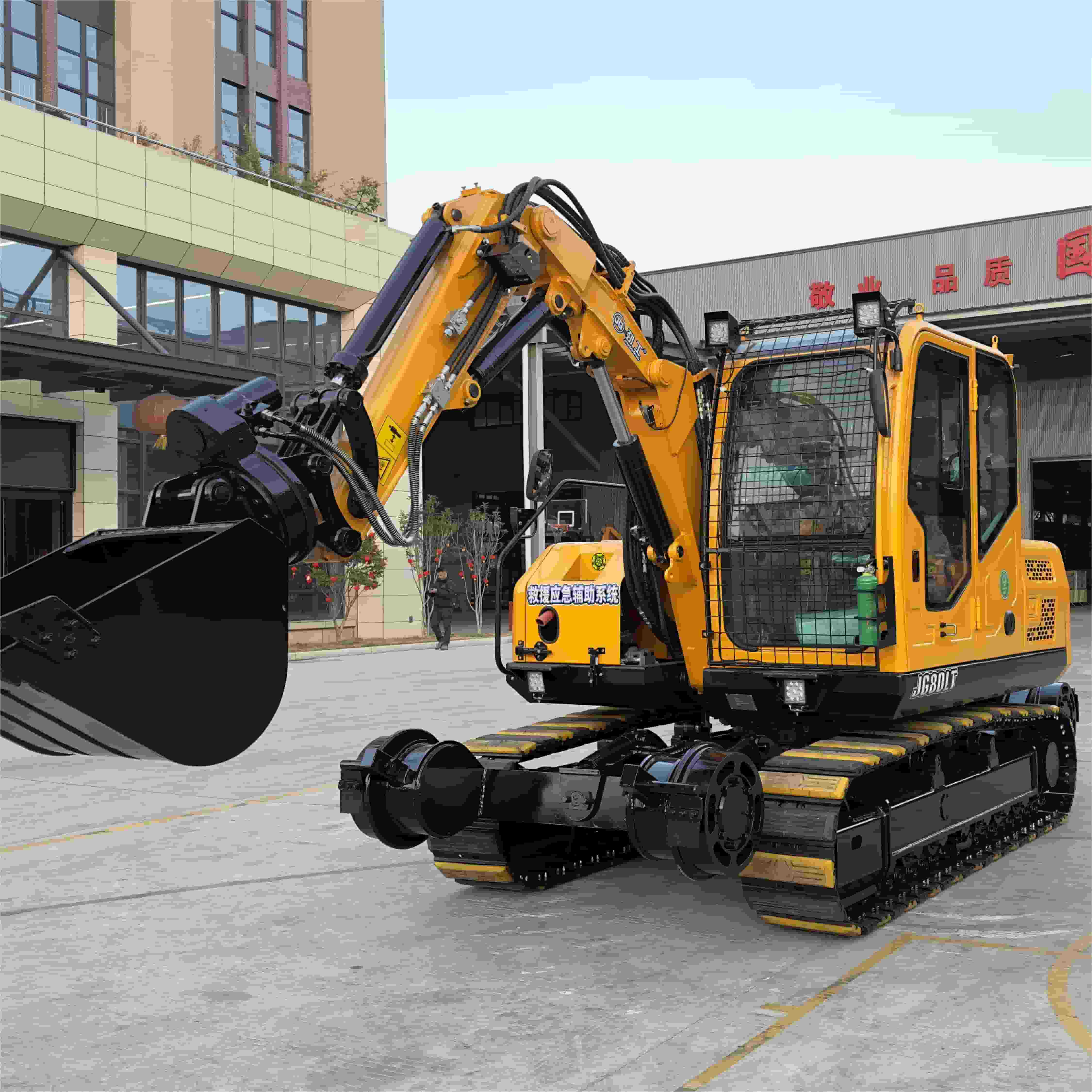 JG80LT 8-Ton Railway Ballast Regulator & Hirail Excavator.Specially designed for efficient track maintenance, integrated ballast finishing and rail overhaul functions. The 8-ton working capacity is adapted to the global standard gauge, and the hydraulic system accurately controls the distribution of ballast to strengthen the stability of the track foundation. Multi-joint manipulator to achieve 360° flexible operation, equipped with replaceable fittings, easy to complete slope shaping, sleepers clear ballast and rail positioning. It conforms to ISO safety certification, ADAPTS to complex working conditions such as high temperature and cold, greatly reduces manual maintenance costs, and improves railway operation and maintenance efficiency by more than 30%.